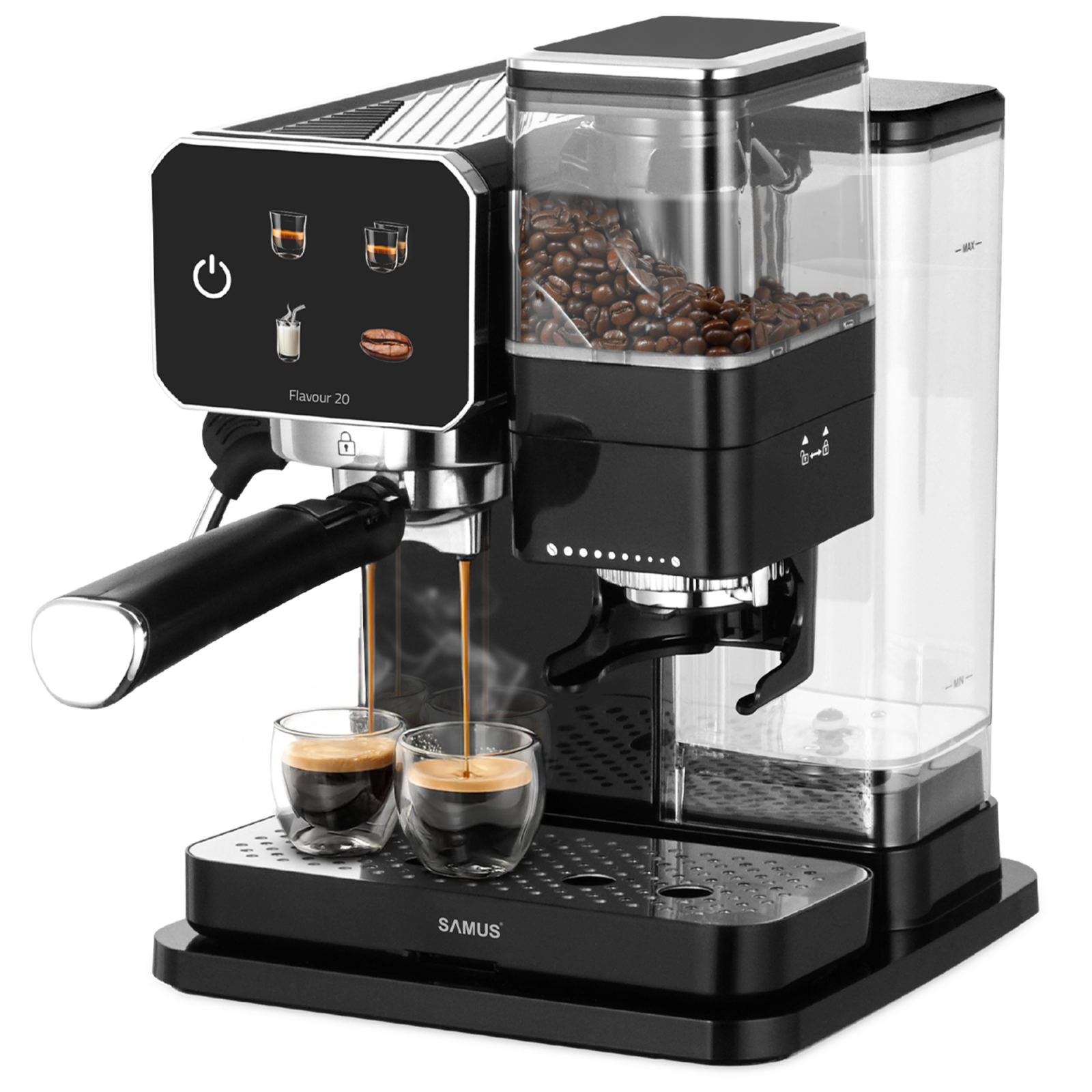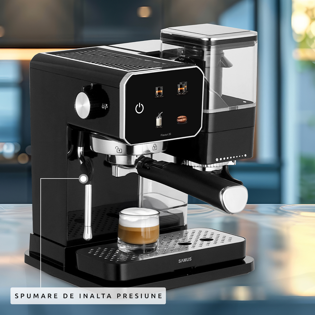 Espressor cafea, manual, ecran tactil, rasnita profesionala, spumare lapte, pompa apa italia 20 bari, rezervor apa 0.9 L, SAMUS