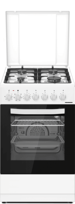 Aragaz cu cuptor electric, 4 arzatoare gaz, timer, gratare fonta, 50 x 60 cm, lumina, ventilatie, alb, HEINNER