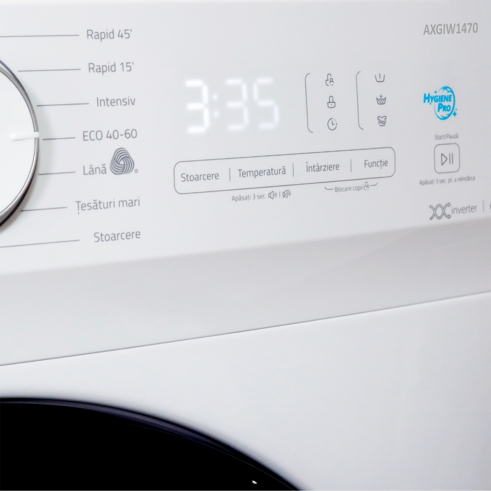 Echipată cu un motor inverter de ultimă generație, Albalux AXGIW1471 funcționează silențios, are o durată de viață extinsă și un consum redus de energie. Cu o viteză de centrifugare de până la 1400 rotații pe minut, rufele sunt stoarse eficient, scurtând semnificativ timpul de uscare.