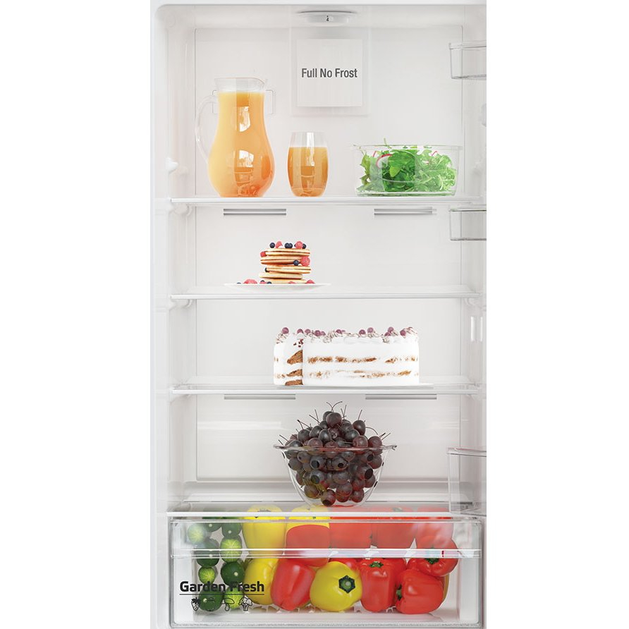 Modelul dispune de un volum total de 324 litri, oferind suficient loc atât pentru produsele proaspete din frigider, cât și pentru alimentele congelate. Tehnologia Full No Frost elimină formarea gheții în interior, ceea ce înseamnă că nu trebuie să dezgheți manual aparatul și menține o temperatură constantă pe toată suprafața.