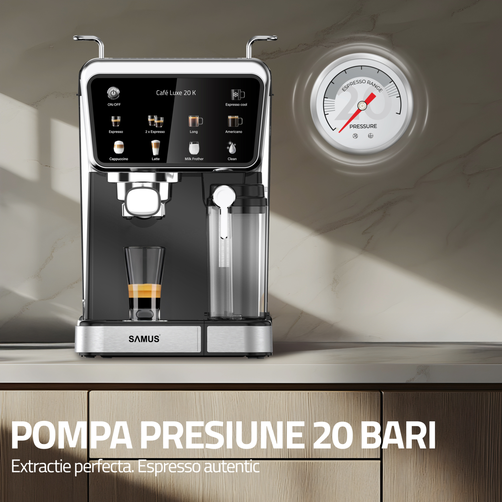 • Presiune: 20 bari, pentru extracție optimă și obținerea unei creme dense