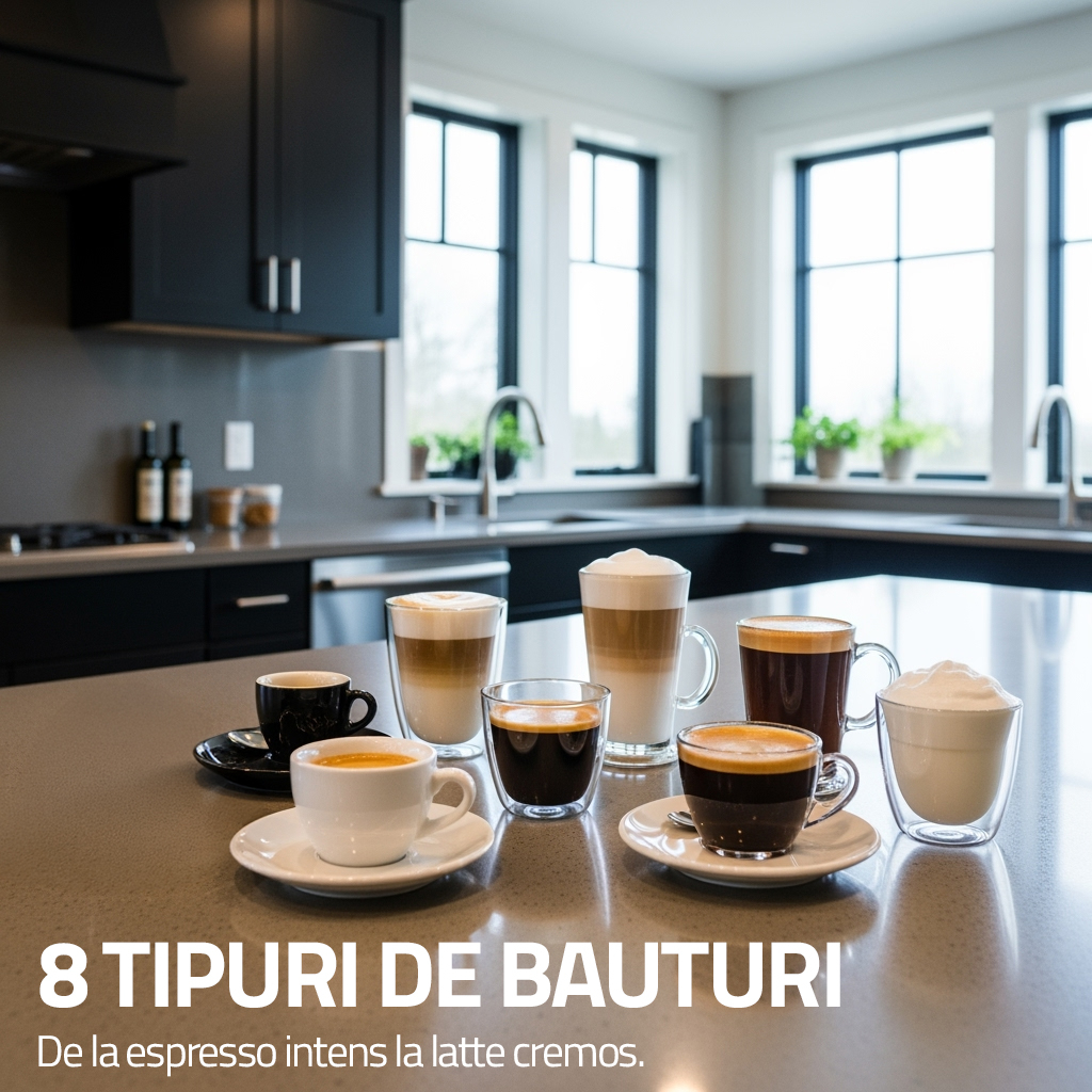 • 8 tipuri de bauturi: Espresso fierbinte, Espresso dublu, Espresso lung, Americano, Espresso, rece, Cappuccino, Latte, Spuma de lapte