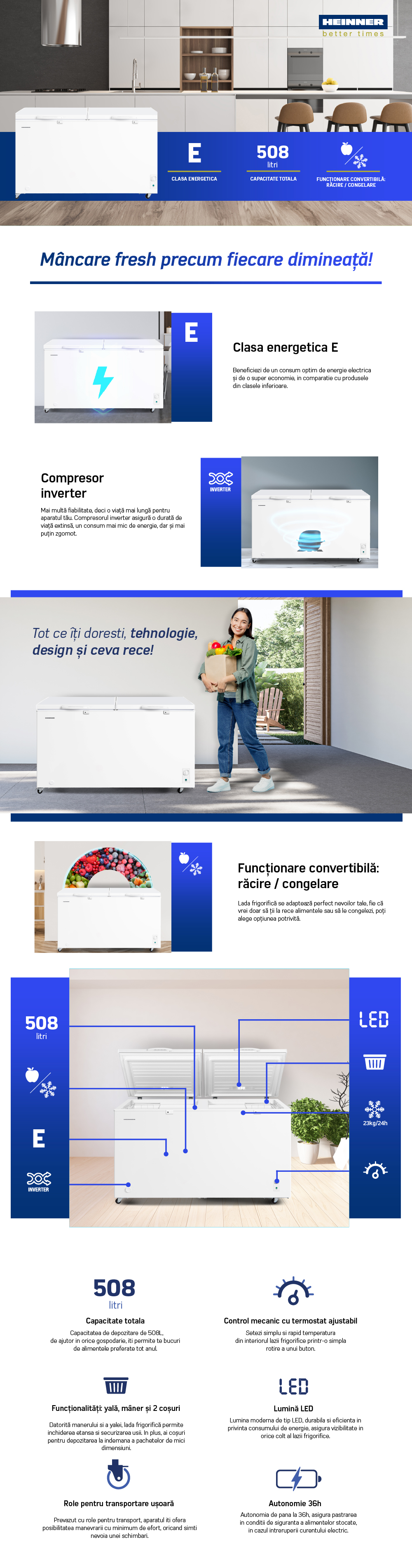 Ladă frigorifică Heinner HCF-M508INVCE++ – 508 L, Compresor Inverter, Convertibilă Frigider/Congelator, Clasa E, Iluminare LED, Alb