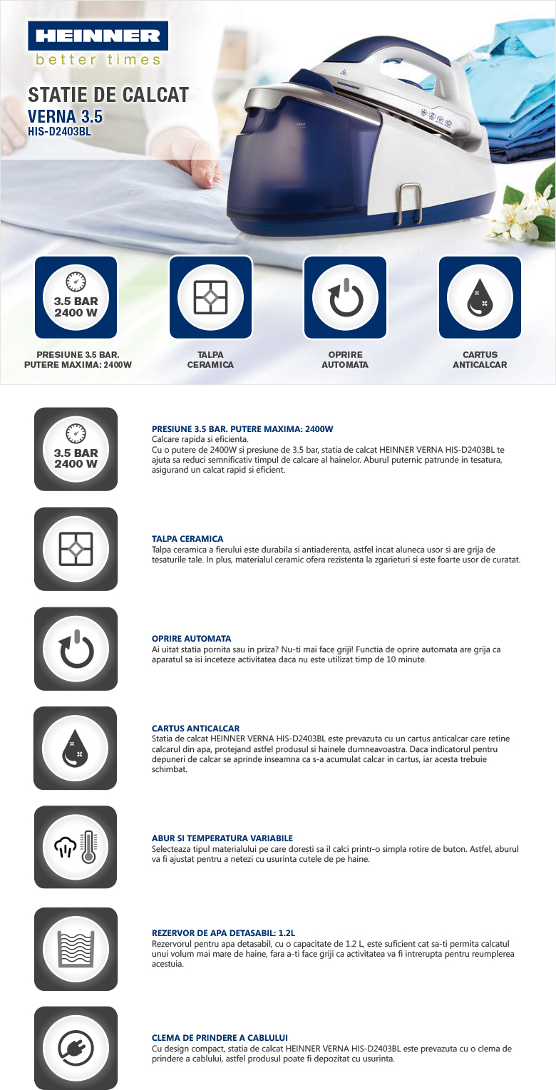Heinner HIS-D2403BL este o stație de călcat practică, fiabilă și ușor de utilizat, perfectă pentru utilizarea zilnică. Cu o putere mare, talpă ceramică și rezervor generos, oferă combinația ideală între performanță, simplitate și protecție pentru haine. Este alegerea potrivită pentru oricine își dorește haine impecabile, fără efort.