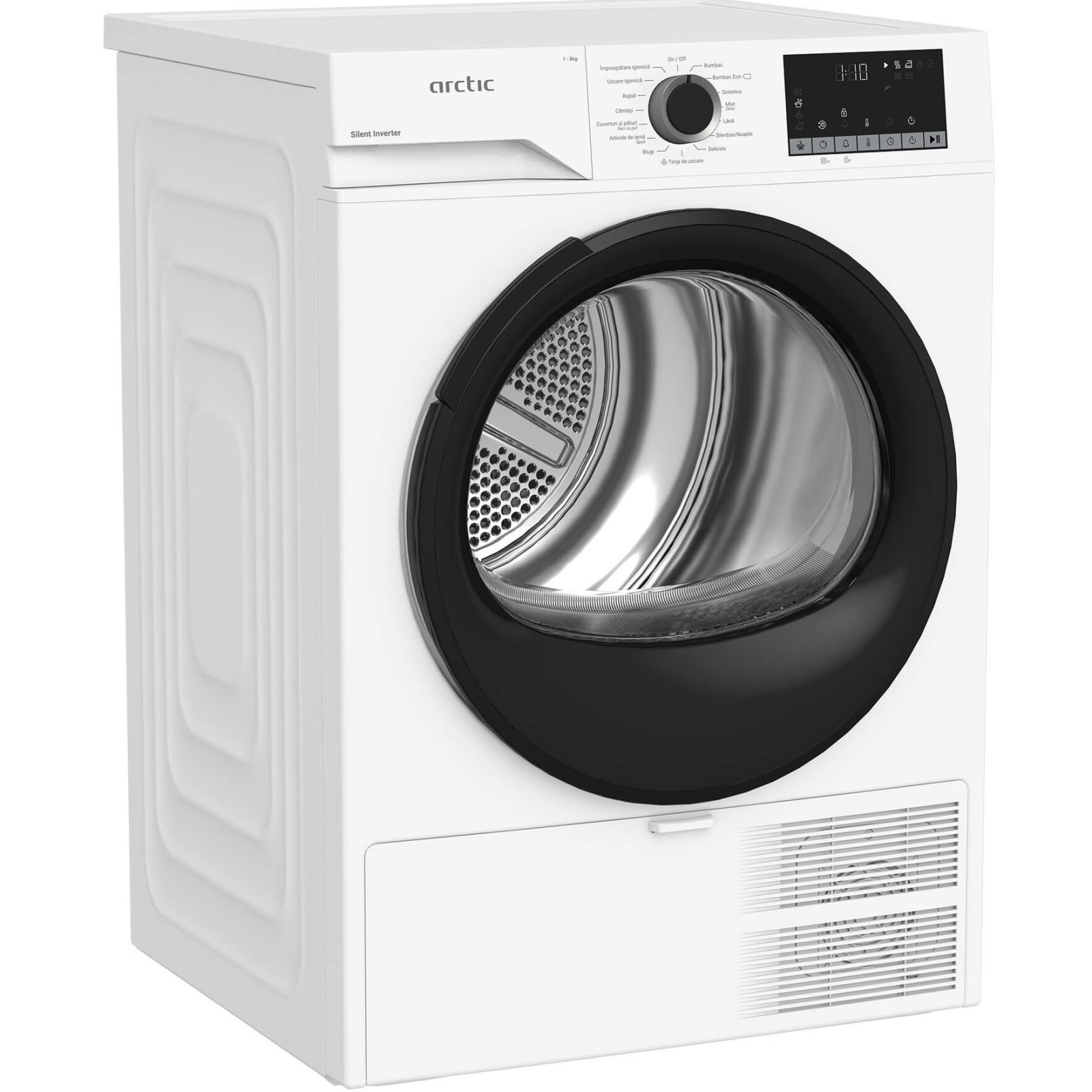 Modelul are o capacitate de 8 kg, ceea ce îl face potrivit pentru familii de dimensiuni medii și pentru încărcături mai mari de rufe. Este echipat cu 15 programe diferite, astfel încât poți adapta uscarea în funcție de tipul de material — de la articole delicate, până la textile mai groase. Funcțiile adiționale precum Motor Silent Inverter asigură un nivel redus de zgomot în timpul funcționării, iar sistemul Aqua Surf contribuie la distribuirea uniformă a aerului în interiorul tamburului pentru rezultate consecvente.